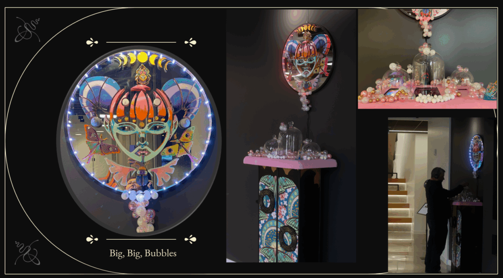 Utilizing Pepper’s Ghost techniques, I have placed three cloches which I fitted with plexiglass interior walls to reflect the video from three mp4 players for which I have built an enclosure. The enclosure includes velvet, felt, resin bubbles, clay beads, and a few found objects (ice cream trinket, etc). The enclosure sits atop a wood chest like a cloud filled landscape, and the chest is covered in art nouveau wall paper, which I hand detailed and augmented with silicon ears within resin frames. With several nods to the Victorian period, I ‘theme’ anachronistic technology such as the wireless headphones and their wireless charging base.